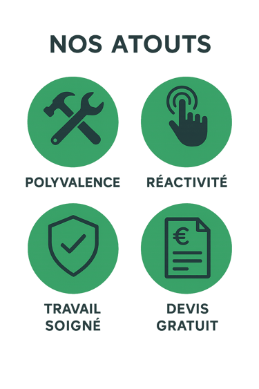 Polyvalence – Une équipe capable d’intervenir dans de nombreux domaines : rénovation, entretien, montage, peinture, plomberie légère et bien plus.